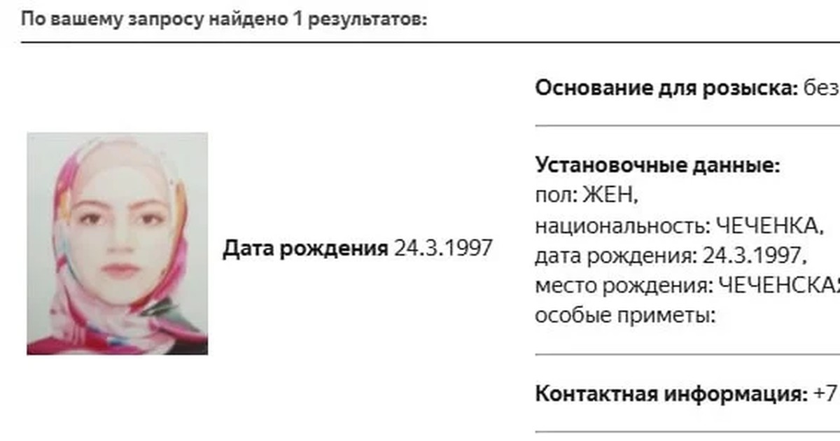 В карточке розыска говорится, что Сулейманову разыскивают как «без вести пропавшую». Судя по коду контактного телефона, в розыск чеченку объявили силовики из Грозного, отмечает издание.