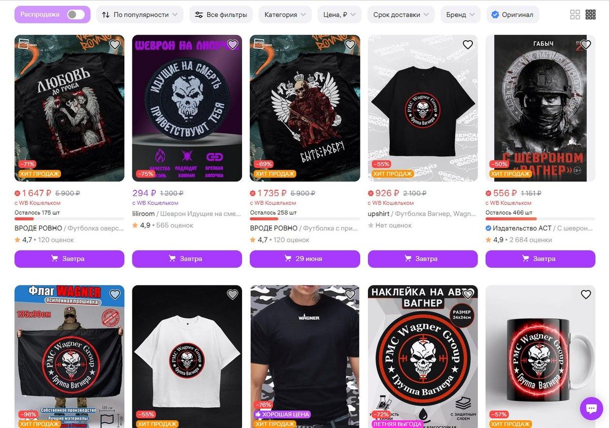 В дни пригожинского мятежа крупные маркетплейсы сообщили, что перестанут продавать мерч ЧВК. Тогда же в городах срывали баннеры с рекламой кампании, Ozon и Wildberries не отставали. Действительно, 24 июня 2023 года по запросам «Вагнер» и «ЧВК» на Ozon нельзя было найти ни единой вещи. Аналогично — на площадках «Сима-ленд» и «Яндекс. Маркет».