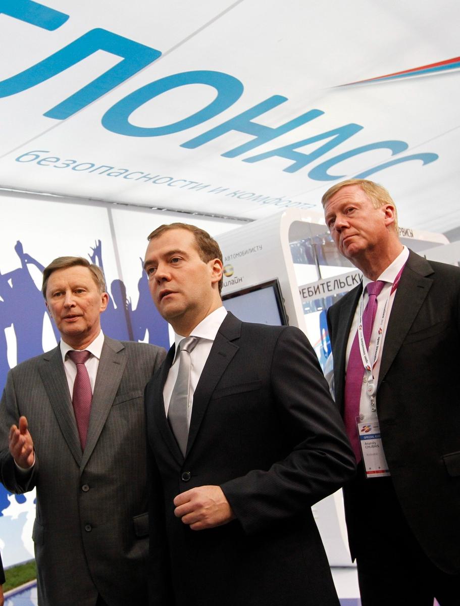 Сергей Иванов, Анатолий Чубайс и Дмитрий Медведев на выставке инновационной продукции в рамках Московского международного форума инновационного развития «Открытые инновации». Фото: ИТАР-ТАСС / Дмитрий Астахов