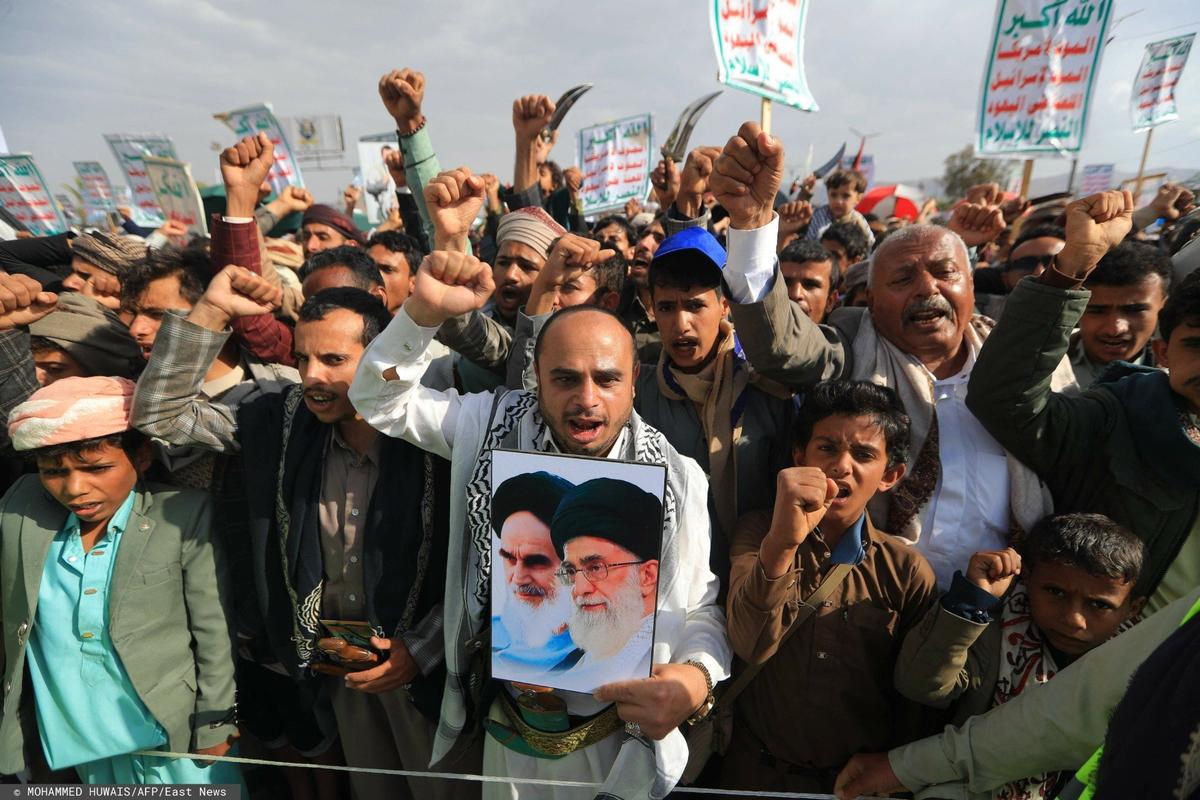 Мужчина держит плакат с портретами покойного верховного лидера Ирана аятоллы Рухоллы Хомейни (слева) и верховного лидера Ирана аятоллы Али Хаменеи. Фото: MOHAMMED HUWAIS / AFP / East News