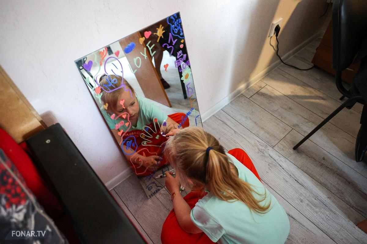 Комната заполнена детьми. Одни девочки за большим столом раскрашивают картинки, другие рисуют на зеркалах и фотографируются.