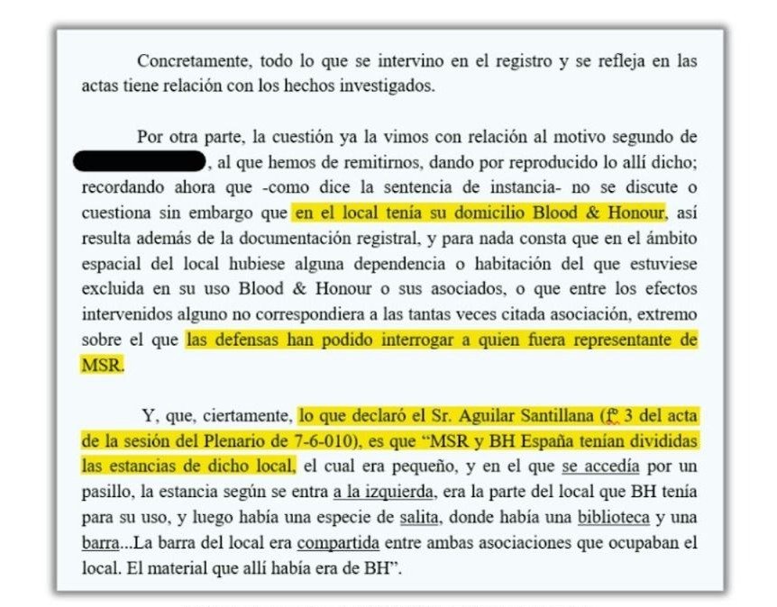 Журналисты проекта Newtral и El Periodico в ходе нашего совместного расследования также нашли постановление Верховного суда от 2011 года, согласно которому Хуан Антонио Агилар в течение нескольких лет возглавлял политическое движение MSR, фракцией которого была неонацистская группа «Blood & Honor» со штаб-квартирой в Сан-Себастьяне-де-лос-Рейес. Члены этого профашистского движения были осуждены за незаконное хранение оружия.