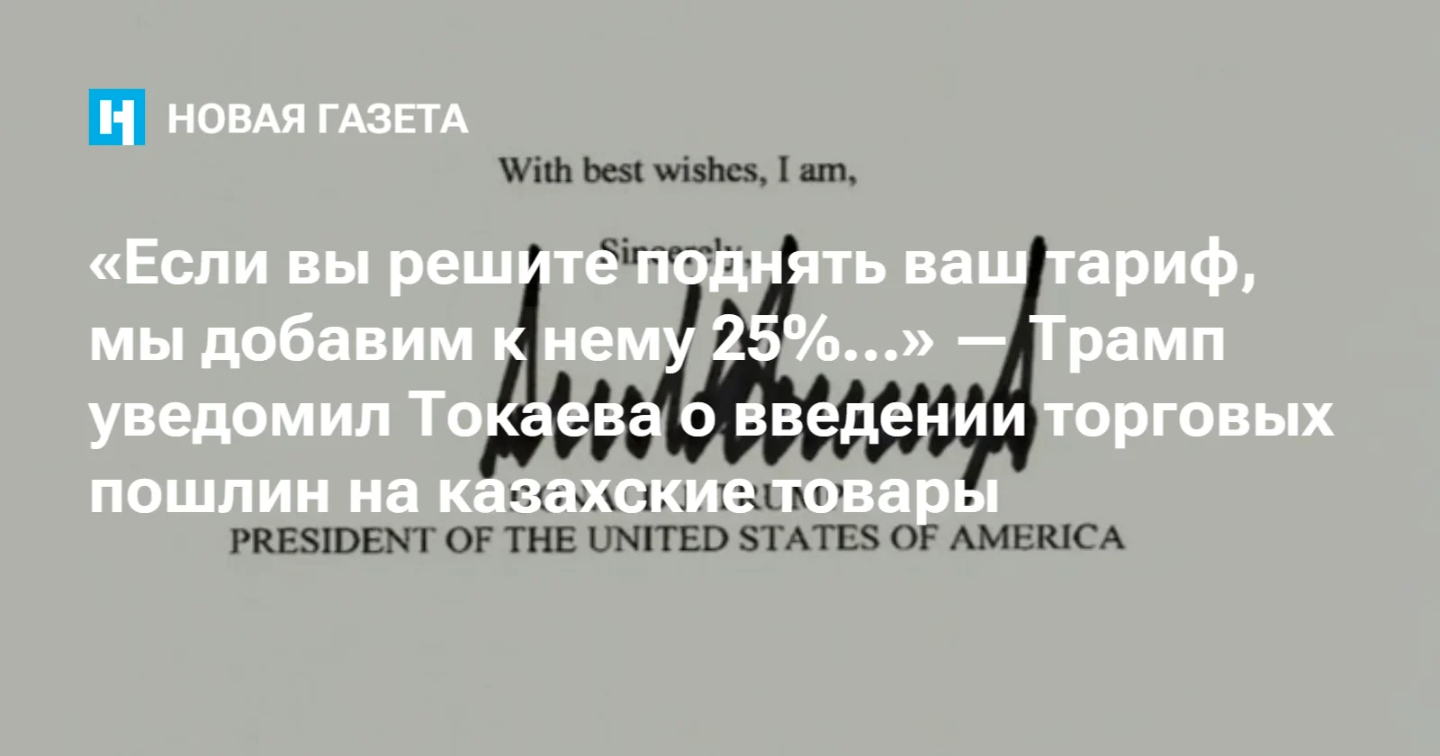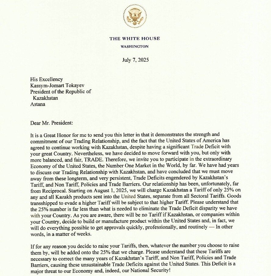 «Дорогой господин Президент! Это большая честь для меня…» — начинает письмо Трамп. Он заявляет, что для установление честной торговли между США и Казахстаном настало время ликвидировать многолетний торговый дефицит — для чего США в одностороннем порядке вводят против всех казахских товаров тариф — «всего 25%». Этот тариф не заменяет секторальные тарифы на особые категории товаров, которые действуют отдельно.