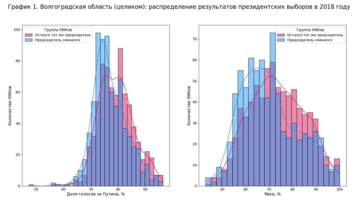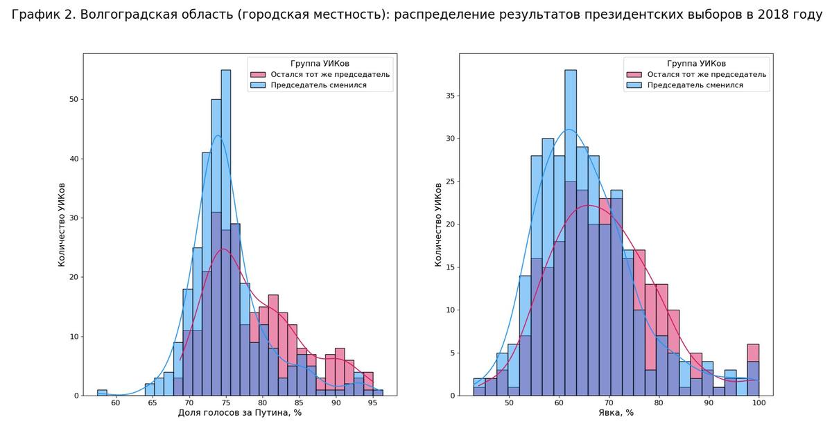 Но разница есть. Взгляните, например, на Волгоградскую область (график 1). Здесь показаны два распределения: розовое — это распределение результатов по УИКам, где остались те же председатели после выборов (сноска 3), а синее — по УИКам, где председатели сменились. Темно-синяя/фиолетовая часть — это их пересечение. Можно заметить, что розовое распределение значительно смещено вправо относительно синего.