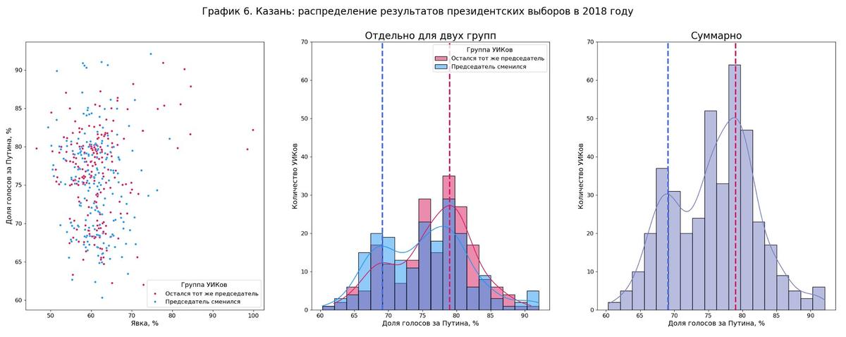 Или, например, на графике 6 можно увидеть похожий случай для отдельно взятой Казани — здесь два разных пика наблюдаются уже не у явки, а у процента голосов за Путина. Только левый пик выше у синего распределения, а правый — у розового.