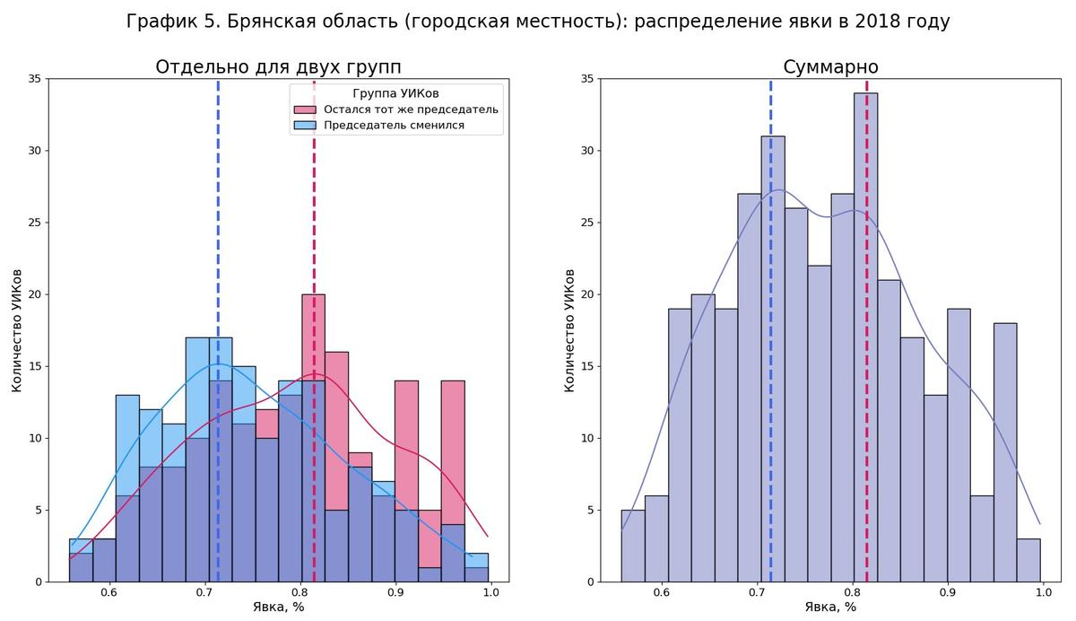 Посудите сами. В той же Брянской области итоговое распределение явки имеет два пика: левый «достался» от группы участков с уволенными председателями, а правый — от группы с оставшимися (см. график 5: пики отмечены синей и розовой пунктирными линиями). Если увольняют честных, то левый пик действительно соответствует кластеру честных участков.
