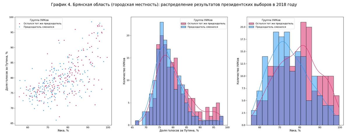 Отдельно выделяются 15 регионов, в которых эта закономерность соблюдается везде или почти везде — как минимум в трех из этих четырех показателей (сноска 7). В том числе это Санкт-Петербург, Московская область, Ленинградская область, Белгородская область, Ростовская область, Башкортостан, Татарстан и другие. Например, на графике 4 можно увидеть Брянскую область (городскую местность), которая тоже входит в число этих 15 регионов. У явки (третий подграфик) видно, что пик розового распределения заметно правее, чем у синего распределения. Самый левый подграфик показывает и явку, и процент за Путина сразу (одна точка — это один УИК). Если приглядеться, то можно увидеть, что справа сверху синие точки встречаются реже, чем слева внизу.