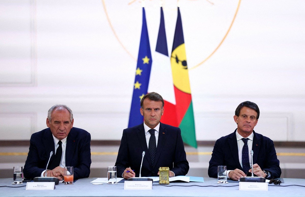 Премьер Франсуа Байру, Эмманюэль Макрон и Мануэль Вальс после подписания проекта соглашения с представителями политических сил Новой Каледонии. Фото: TOM NICHOLSON / AFP / East News