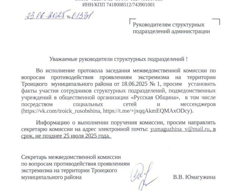 Националистическое движение «Русская община» опубликовало документ, согласно которому администрация Троицкого района Челябинской области попросила свои силовые структуры «установить» «факты участия» троицких чиновников и других представителей районной власти в деятельности общины, в том числе с помощью мониторинга соцсетей движения.