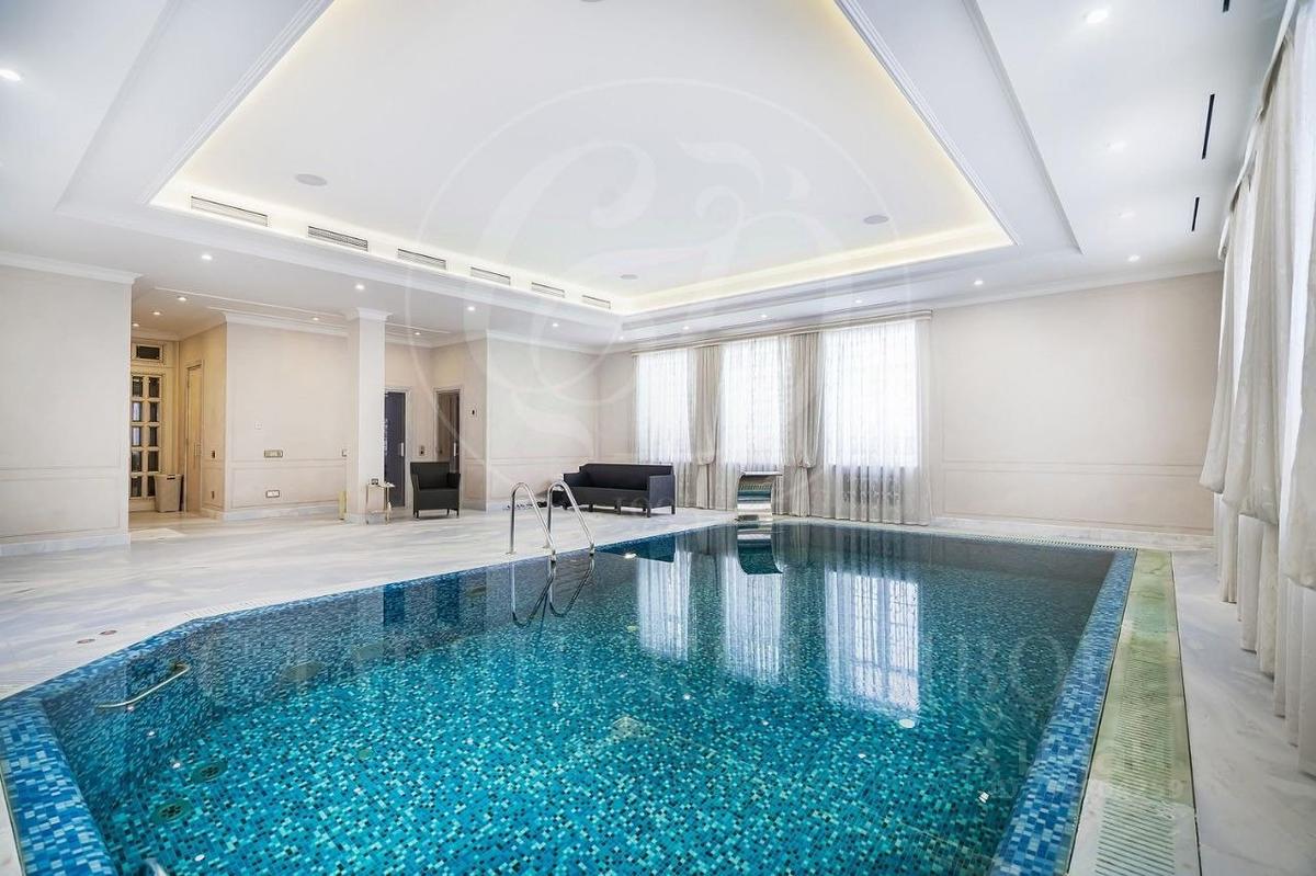 «Красивый дом с бассейном в классическом стиле. Эксклюзивная отделка и мебель. Много места для хранения. В доме установлен лифт. Спланированы: просторная женская мастер-спальня с ванной комнатой и вместительной гардеробной. Оформленная в сдержанных тонах, мужская мастер-спальня с гардеробной и санузлом. Дополнительная спальня со всеми удобствами. На первом уровне кабинет трансформируется в четвертую спальню при необходимости. Профессиональная кухня с элеваторной системой подачи блюд. Холодильник для шуб. Огромная прачечная. Винный погреб. И другие неотъемлемые элементы комфортной загородной жизни».
