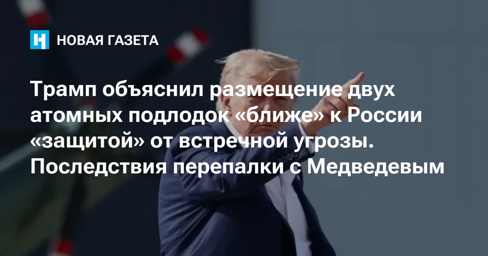 Президент США Дональд Трамп только лично комментирует размещение двух американских атомных подлодок «в определенных регионах», приказ о котором он дал — в ответ на «крайне провокационные», по словам президента США, заявления Дмитрия Медведева.