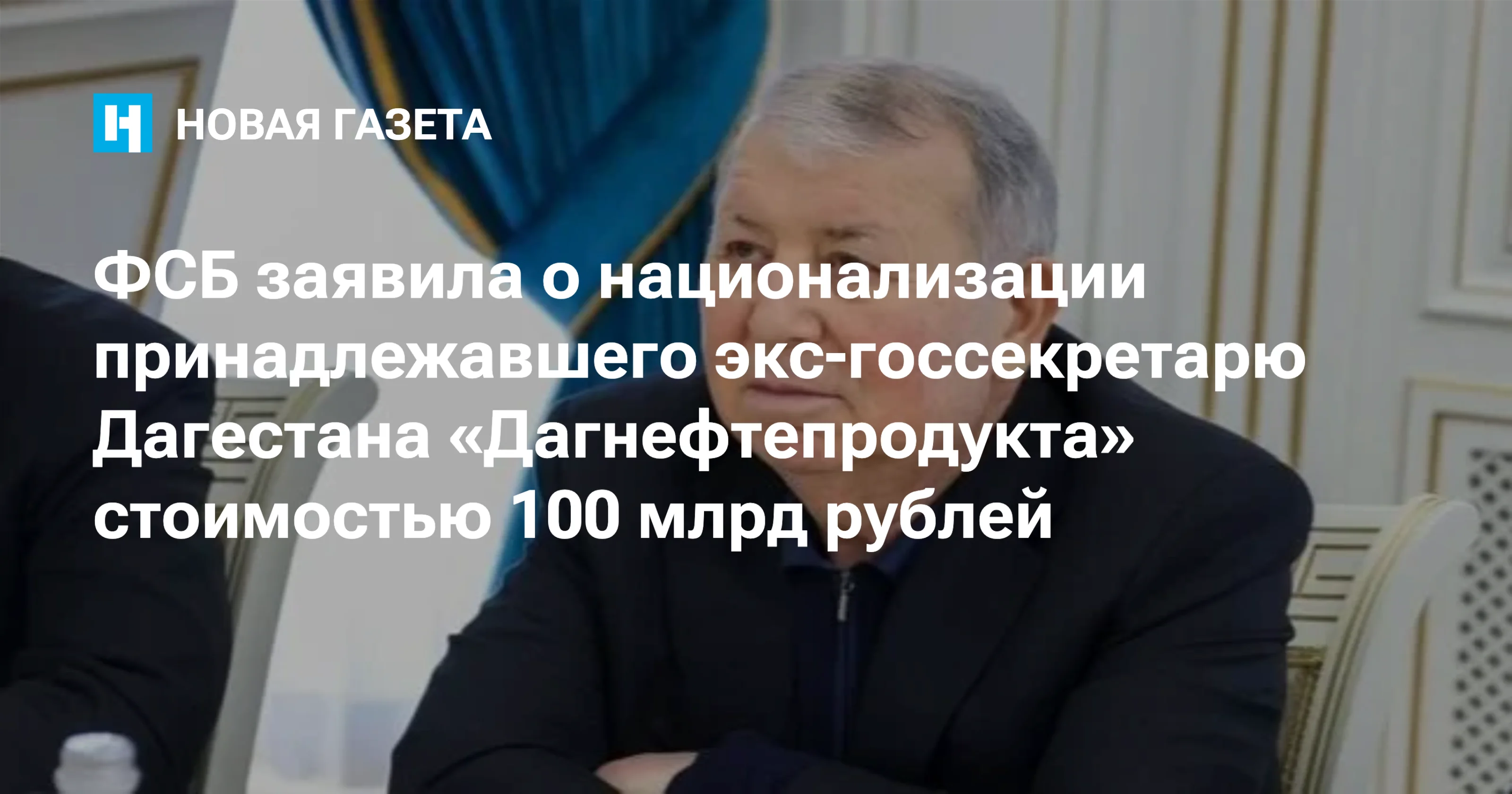 Бывший госсекретарь Дагестана Магомед-Султан Магомедов причастен к хищению у государства нефтеперевалочного предприятия «Дагнефтепродукт» стоимостью 100 млрд рублей, заявила ФСБ. Как сообщила служба, оно уже изъято в пользу государства по иску Генпрокуратуры решением суда в Махачкале.