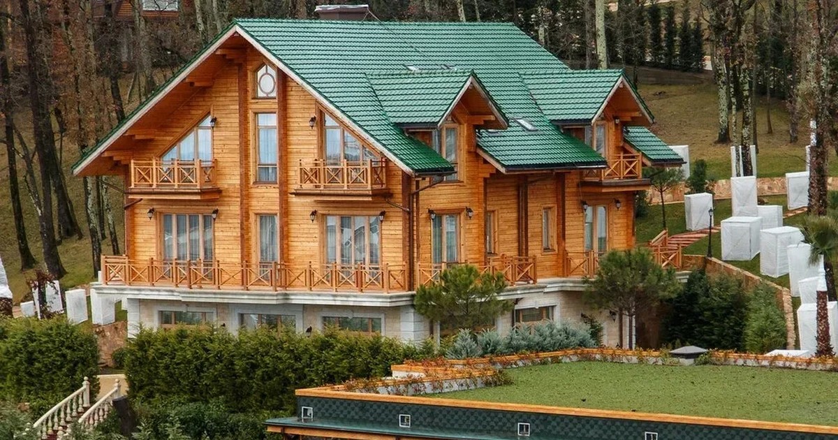 Домик на деле оказался рубленой по финской технологии усадьбой с зеленой крышей, напоминающей бывшую резиденцию Януковича в Межигорье. Только немного скромнее. На территории — еще несколько особняков для жизни и развлечений, чтобы не сильно тесниться. По периметру — высокие кипарисы, которые обеспечивают постояльцу приватность.