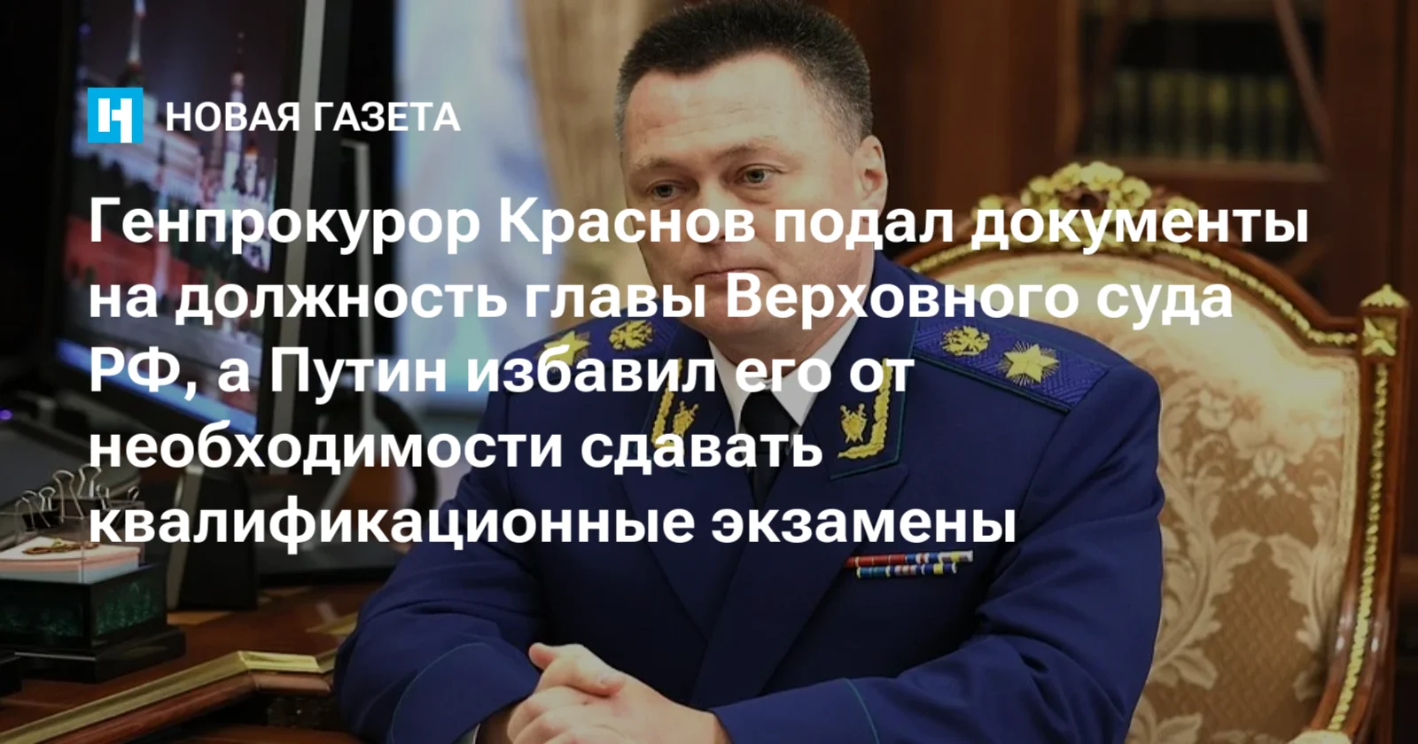Новым главой Верховного суда, похоже, станет нынешний генпрокурор Игорь Краснов. Сегодня стало известно, что он подал заявление в Высшую квалификационную коллегию Верховного суда на эту должность, о чем сообщил председатель коллегии Николай Тимошин.