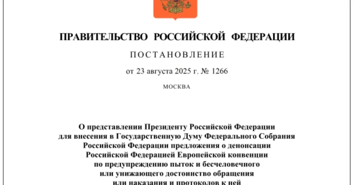 Премьер-министр Михаил Мишустин подписал постановление, в котором предлагает президенту Владимиру Путину выйти из Европейской конвенции по предупреждению пыток и бесчеловечного обращения или наказания. Документ был подписан 23 августа, но на официальном портале правовых актов появился лишь накануне.