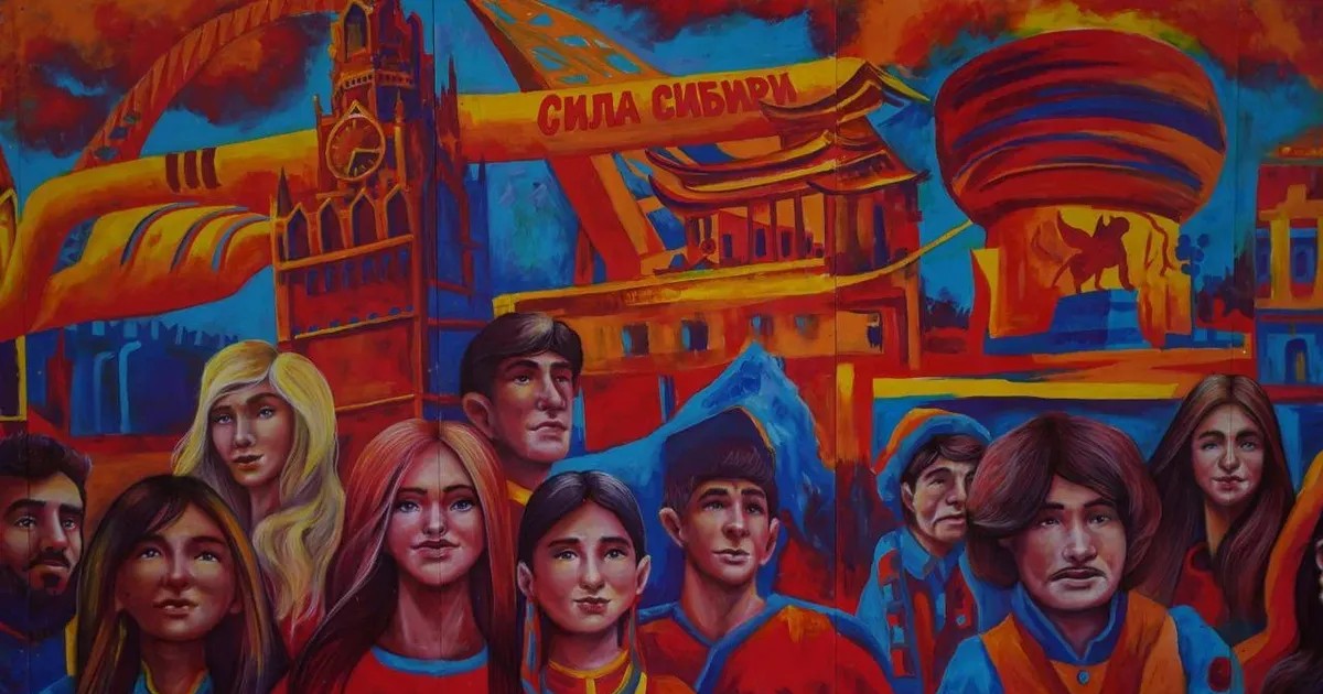 …Что до Красноярска, то еще два года назад ко Дню народного единства в самом центре города газопровод «Сила Сибири»… нарисовали. На стене. Красками. Ну чтоб хоть где-то был. «Уличный рисунок размером с дом — 20 метров в длину». «Крутой арт-объект, фотозона и просто место притяжения». «Мы вложили в рисунок мощь достопримечательностей и достижений России». Нейросеть сгенерировала, художники перенесли на стену.