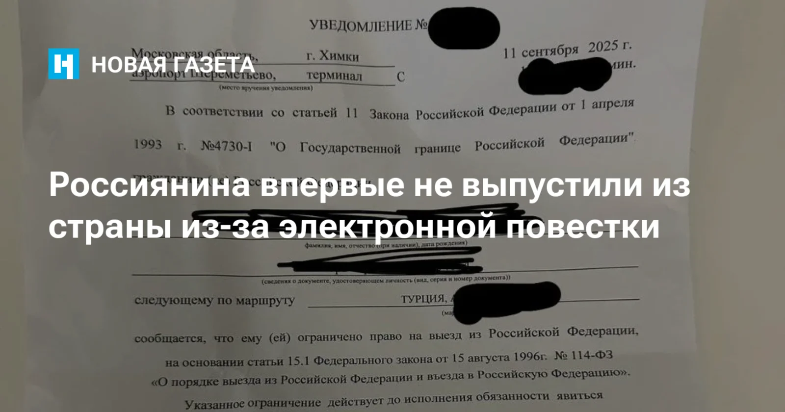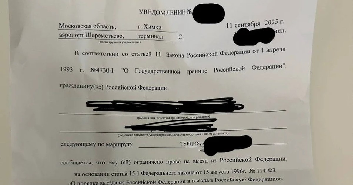 28-летнему жителю Краснодарского края запретили вылет из России в Турцию на основании врученной электронной повестки, рассказал он сам телеграм-каналу «Пограничный контроль», прикрепив «уведомление» выданное ему в аэропорту Шереметьево 11 сентября.