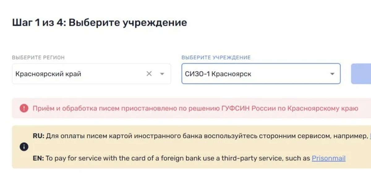«Прием и обработка писем приостановлено по решению ГУФСИН России по Красноярскому краю».