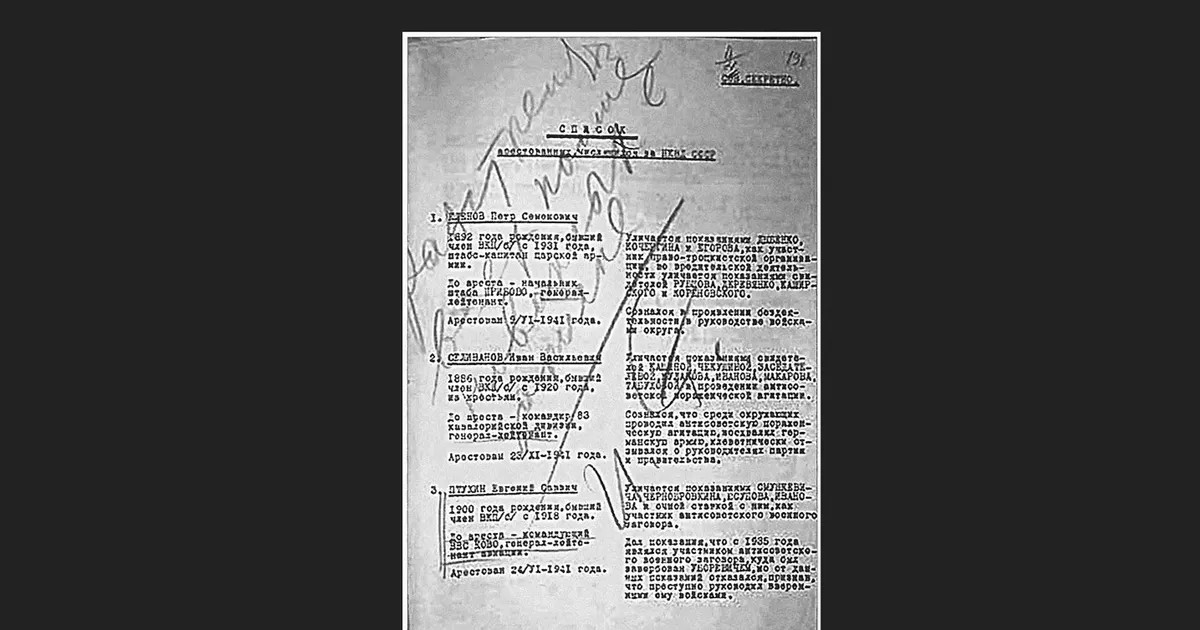 В тексте «Записки» начальника Следственной части по особо важным делам НКВД печально знаменитого Льва Влодзимерского фамилии Сталина и наркома вооружения Ванникова вписаны им от руки. Скоро, правда, Ванникова арестуют и его фамилию можно будет не маскировать.