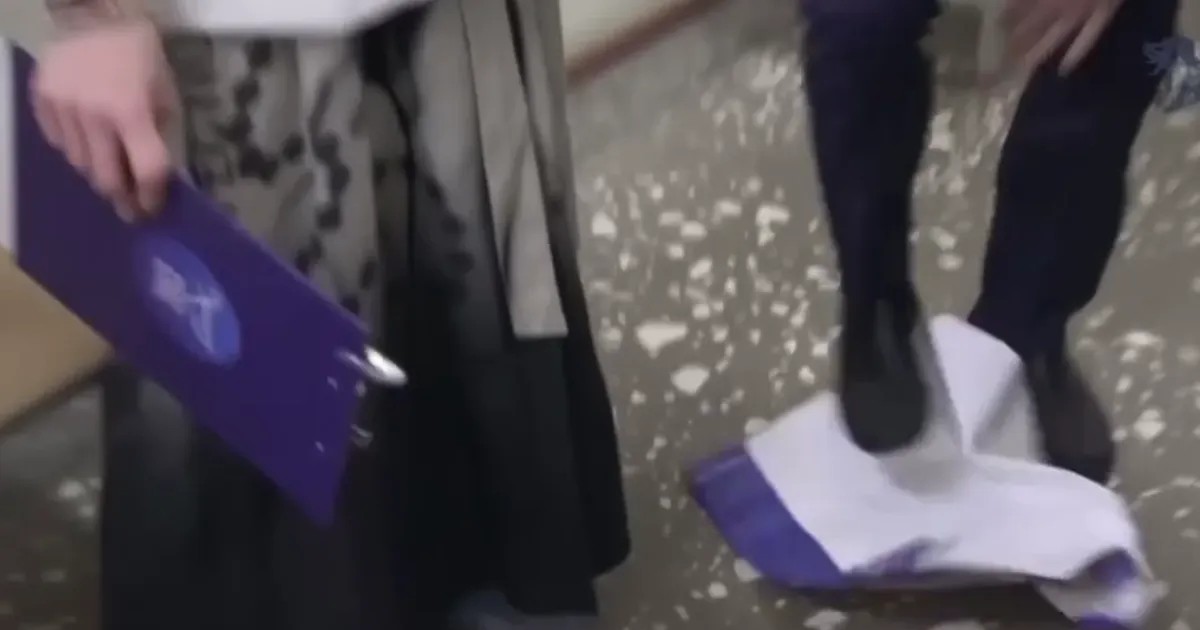 После ее слов Ицкович, державший плакат в руках, положил его на пол и растоптал перед камерами.
