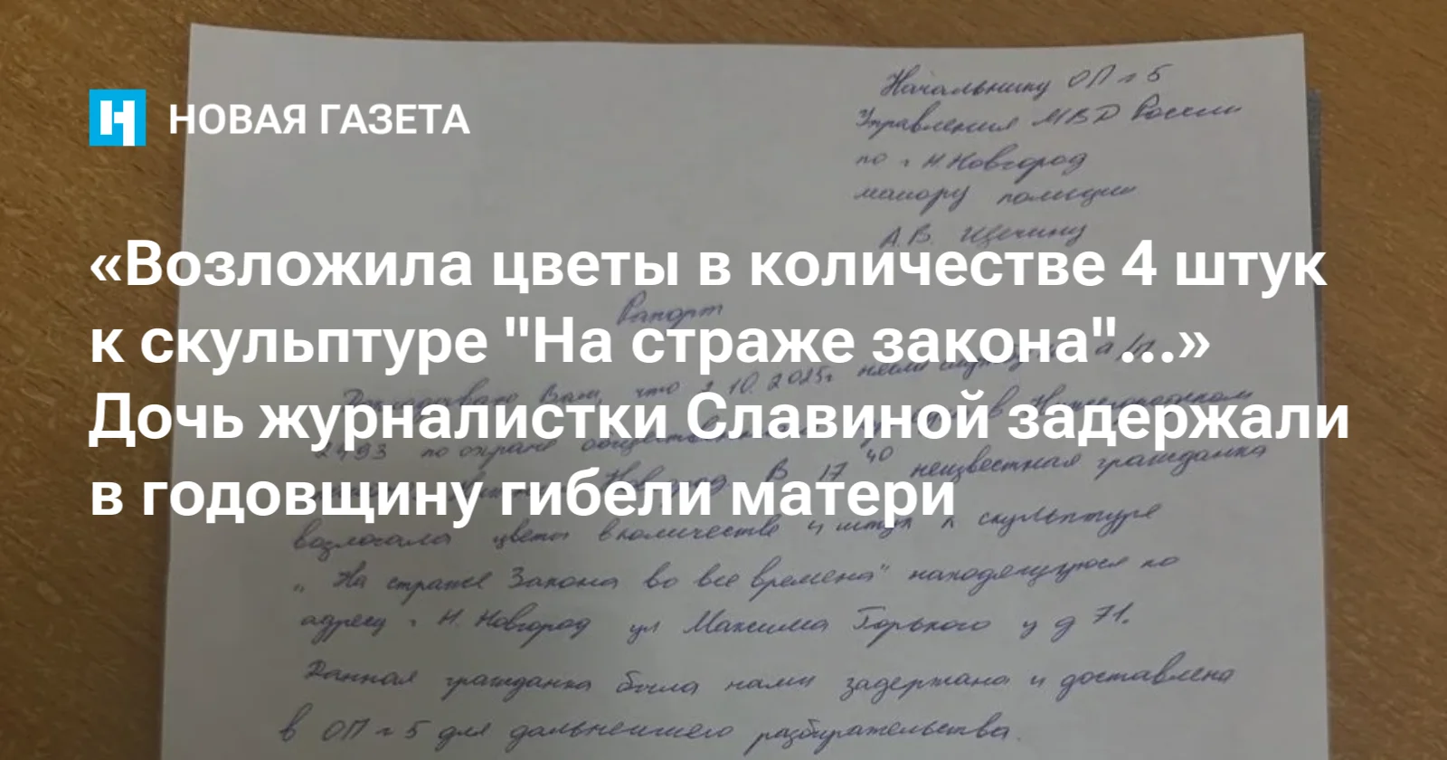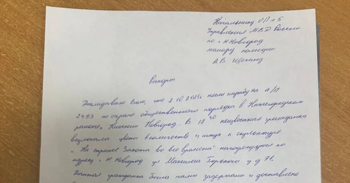 «Докладываю, что 2 октября <...> в 17:40 неизвестная гражданка возложила цветы в количестве 4 штук к скульптуре "На страже закона во все времена", находящуюся по адресу Нижний Новгород, улица Горького д. 71. Данная гражданка была нами задержана и доставлена для дальнейшего разбирательства...»