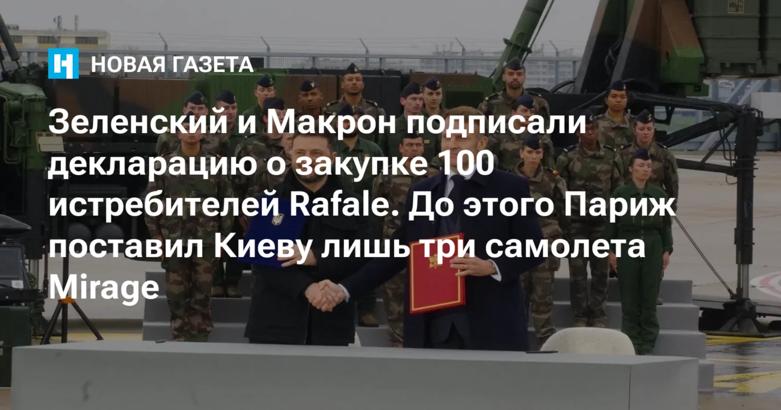 Владимир Зеленский и Эмманюэль Макрон поучаствовали сегодня в нескольких мероприятиях в Париже и пригородах, чтобы обсудить военные нужды Украины и сотрудничество оборонных промышленностей двух стран. День начался с того, что на военной авиабазе Виллакубле к юго-западу от Парижа президенты подписали «историческое соглашение» — «декларацию о намерениях, касающуюся сотрудничества в области приобретения Украиной французского оборонного оборудования». «Гвоздем» программы стала договоренность о поставке ВСУ 100 флагманов французской боевой авиации — «истребителей Rafale F-4 с сопутствующим вооружением». Истребители — «последней модификации», подчеркнул президент Франции.Примерная цена одного самолета начинается в районе 80 млн евро и, в зависимости от «начинки» и условий контракта, может превышать 250 млн.