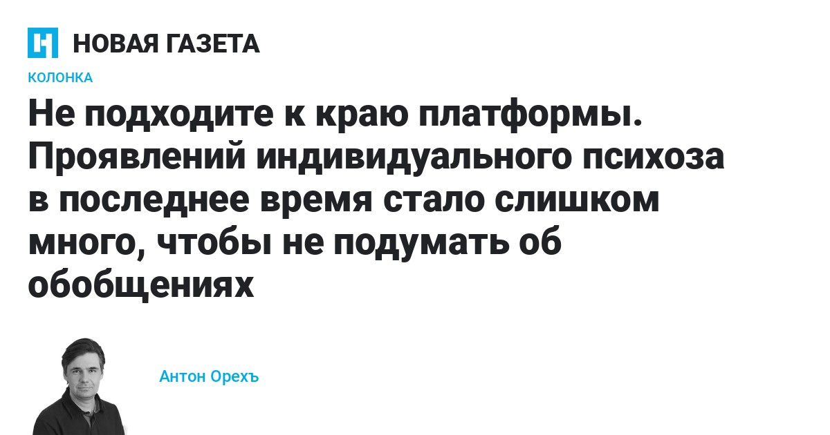 Я не утверждаю, что описанные мною конкретные случаи стали возможны именно в силу атмосферы в обществе. В конце концов, психи и неуравновешенные личности будут всегда и при любом режиме. Но проявлений индивидуального психоза в последнее время стало слишком много, чтобы не подумать об обобщениях. И постараться не стоять на краю платформы.