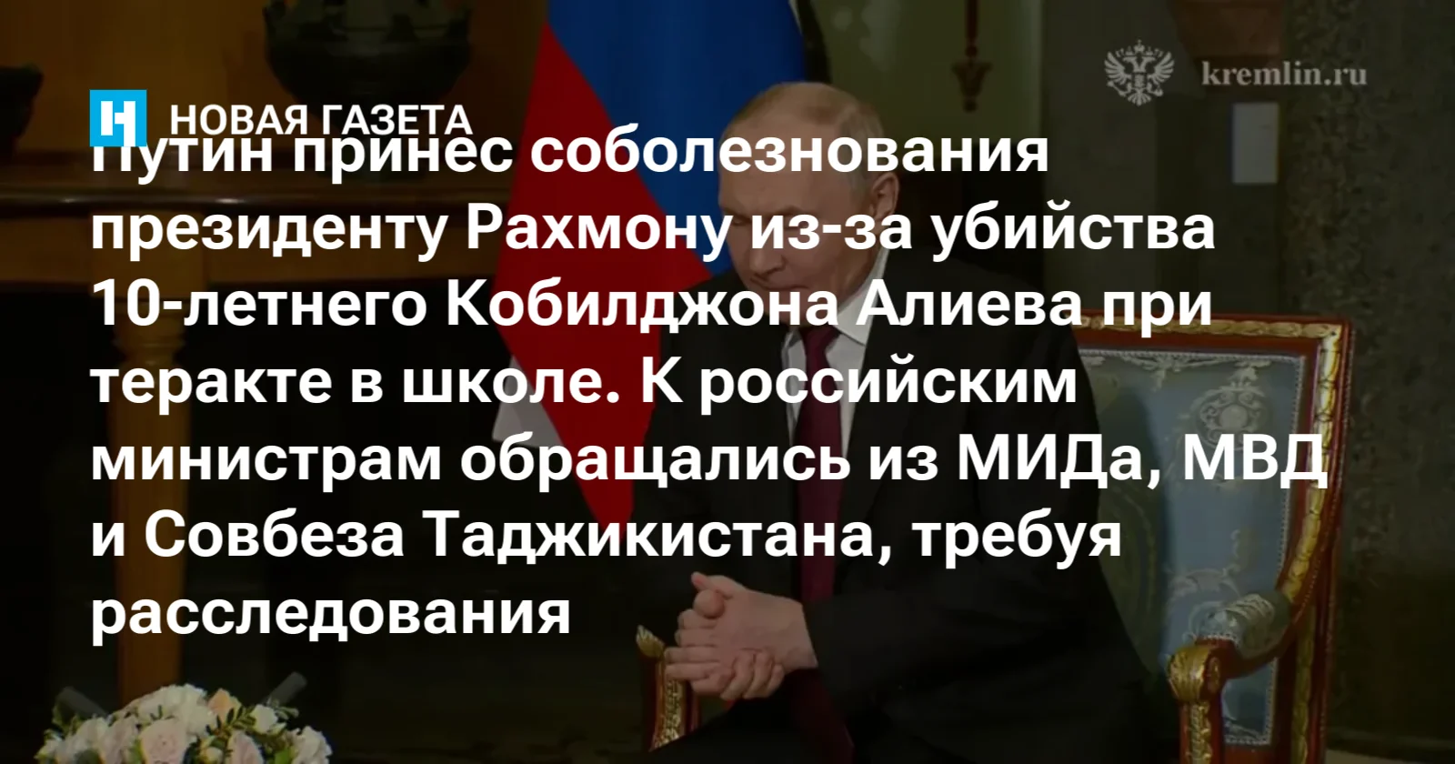 Начать хотел бы со слов искренних соболезнований и вам, и семье мальчика из Таджикистана который погиб несколько дней назад. Совершение терактов в отношении детей — это особенно отвратительно… Вне всякого сомнения следствие будет доведено до конца и виновные, если их несколько, безусловно, будут наказаны в полном объеме», — пообещал Путин.