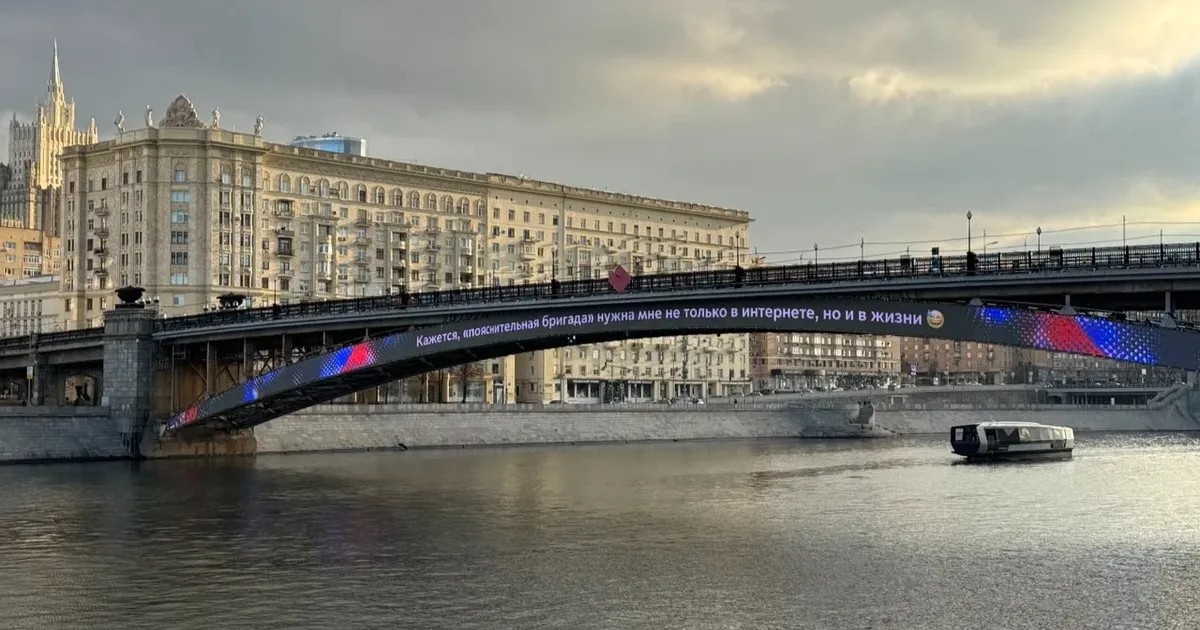 — Эта надпись горит и горит, не раздражает, хотя я этот мост помню с малых лет. Тут есть нормальные какие-то строки, весёлые, какие-то относятся к профессиональным праздникам. Про метро там. А бывает, прочитаешь, и сразу мысль возникает: ничего не смогли придумать. Во всяком случае, это больше в сторону созерцания и позитива, чем не-буду-говорить-что-другое.
