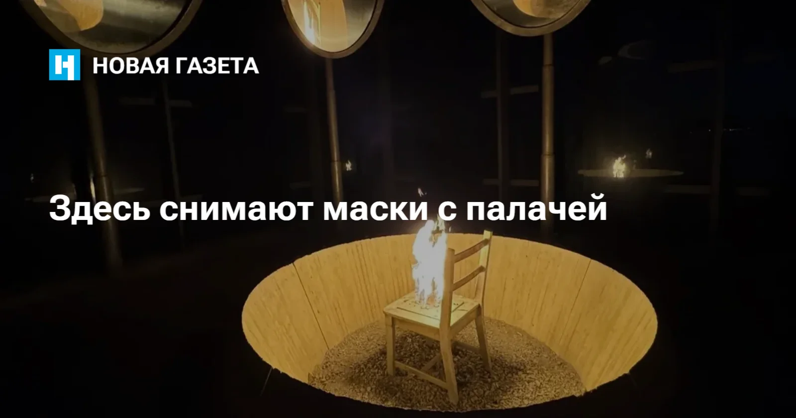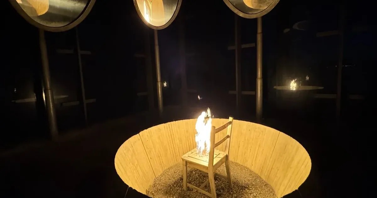 Пять языков пламени вырываются из металлического стула, стоящего в центре круга. Над ним — наклонные овальные зеркала, в которых отражаются зрители. Ты видишь себя частью толпы, глазеющей на казнь, соучастником убийства. А чувствуешь — тем, кого не казнили лишь по случайности.