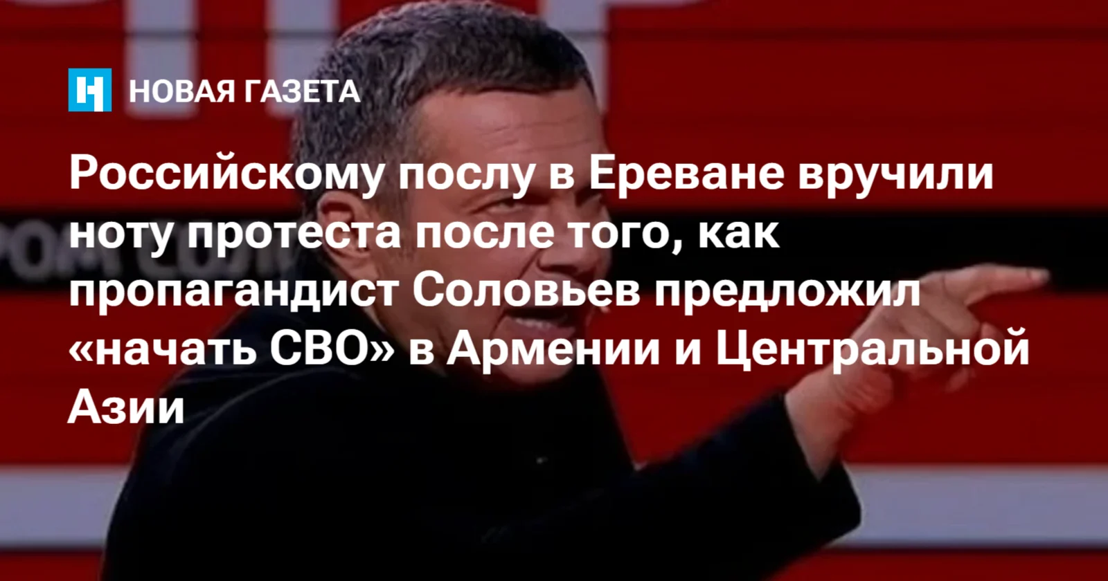 МИД Армении вызвал посла России в стране Сергея Копыркина из-за высказываний телеведущего Владимира Соловьева, который высказал идею «начать СВО» в Центральной Азии.