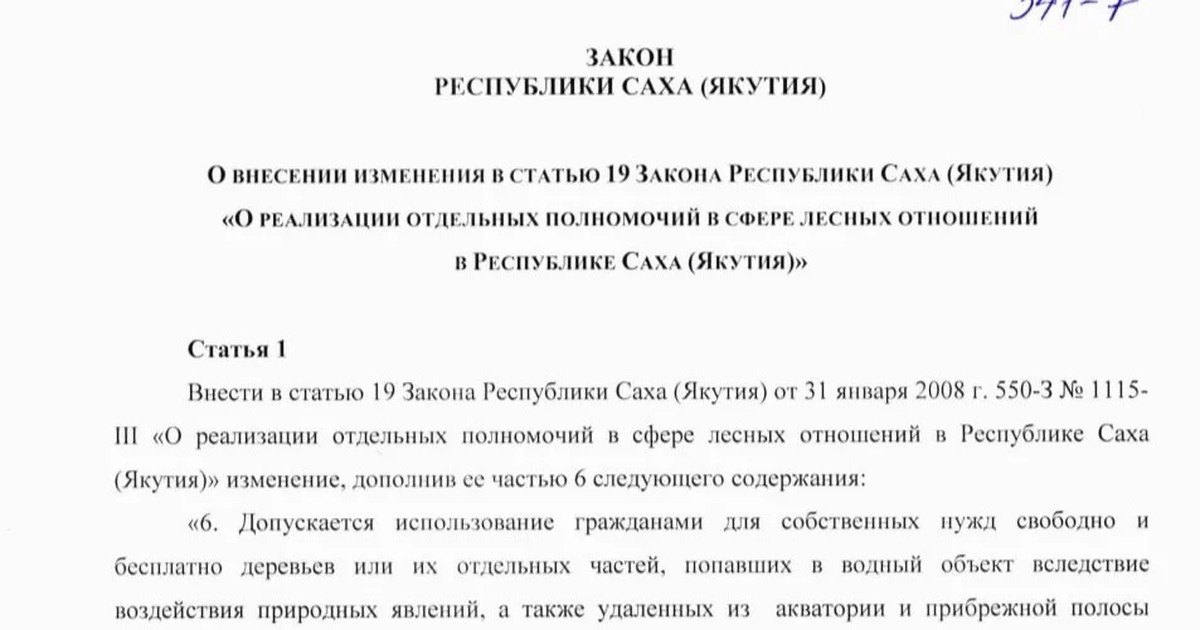 Депутаты Ил Тумэна (госсобрание) Якутии от «Единой России» разработали проект поправок в региональный закон о лесных отношениях, который разрешает жителям вылавливать деревья и ветки из водоемов. Внимание на документ обратило «Торбозное радио».