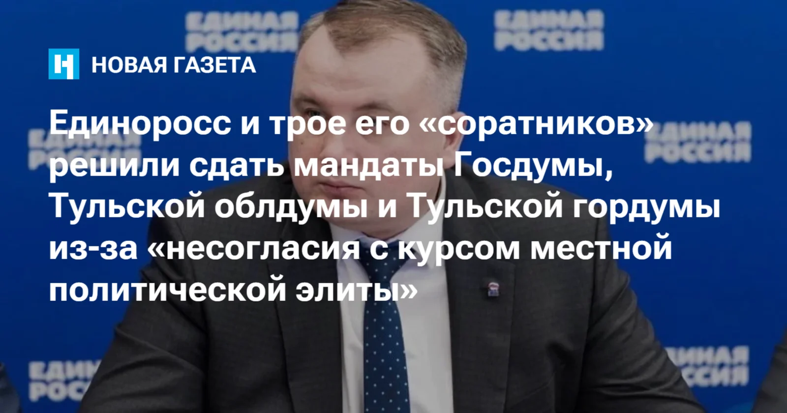 Депутат Госдумы от Тульской области Виктор Дзюба («Единая Россия») решил отказаться от своего мандата: он опубликовал в соцсетях письмо экс-губернатору региона, помощнику Путина Алексею Дюмину, в котором заявил, что расходится с политической элитой Тульской области «в понимании, как нужно по совести и по справедливости» служить стране.
