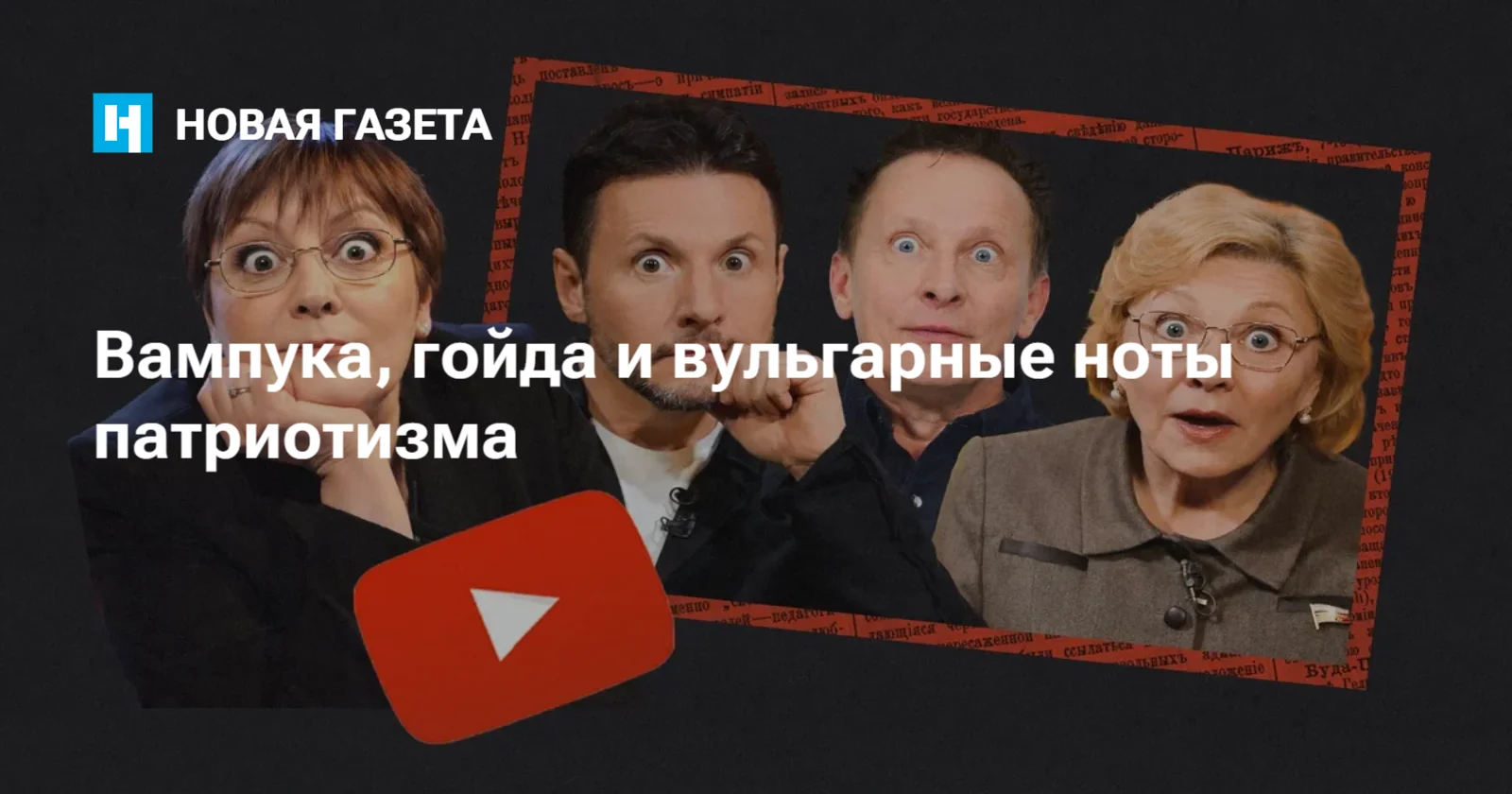 Ой, а вот тут мы с Драпеко совпали. Я тоже иногда вижу «что-то подобное». Например, в самом начале большого концерта ко Дню защитника Отечества, показанного каналом «Россия 1», на сцену под песню «В серой шинели рядового шел солдат» вышла группа артистов в гимнастерках и мундирах времен Великой Отечественной войны. Читали что-то вроде литературно-драматической композиции на тему той великой победы. А командовал этим отрядом тоже артист, а ныне большой начальник Игорь Угольников — в мундире, явно с трудом застегнувшемся на его раздавшейся груди, с маршальскими звездами на погонах и в галифе, заправленными в сапоги. Он первым, как и положено военачальнику, двинулся со сцены в зал к зрителям — в основном участникам СВО, — волоча за собой и накрывая публику поверх голов алым полотнищем: «Передаем вам это святое знамя, ребята, а дальше надежда на вас». Кажется, именно такого рода патриотические мероприятия в младые лета Елены Драпеко назывались «вампукой», но, может, она имела в виду что-то иное. Чисто советское. Голимый агитпроп.