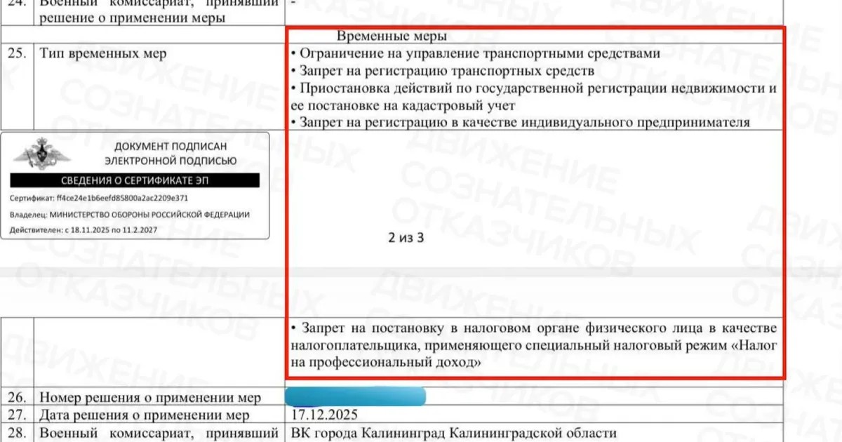Правозащитная организация «Движение сознательных отказчиков*» сообщила, что призывник из Калининграда получил повестку для уточнения данных еще в ноябре 2025-го года — и через 20 дней после неявки в военкомат в системе отразилось введение пяти дополнительных ограничений.
