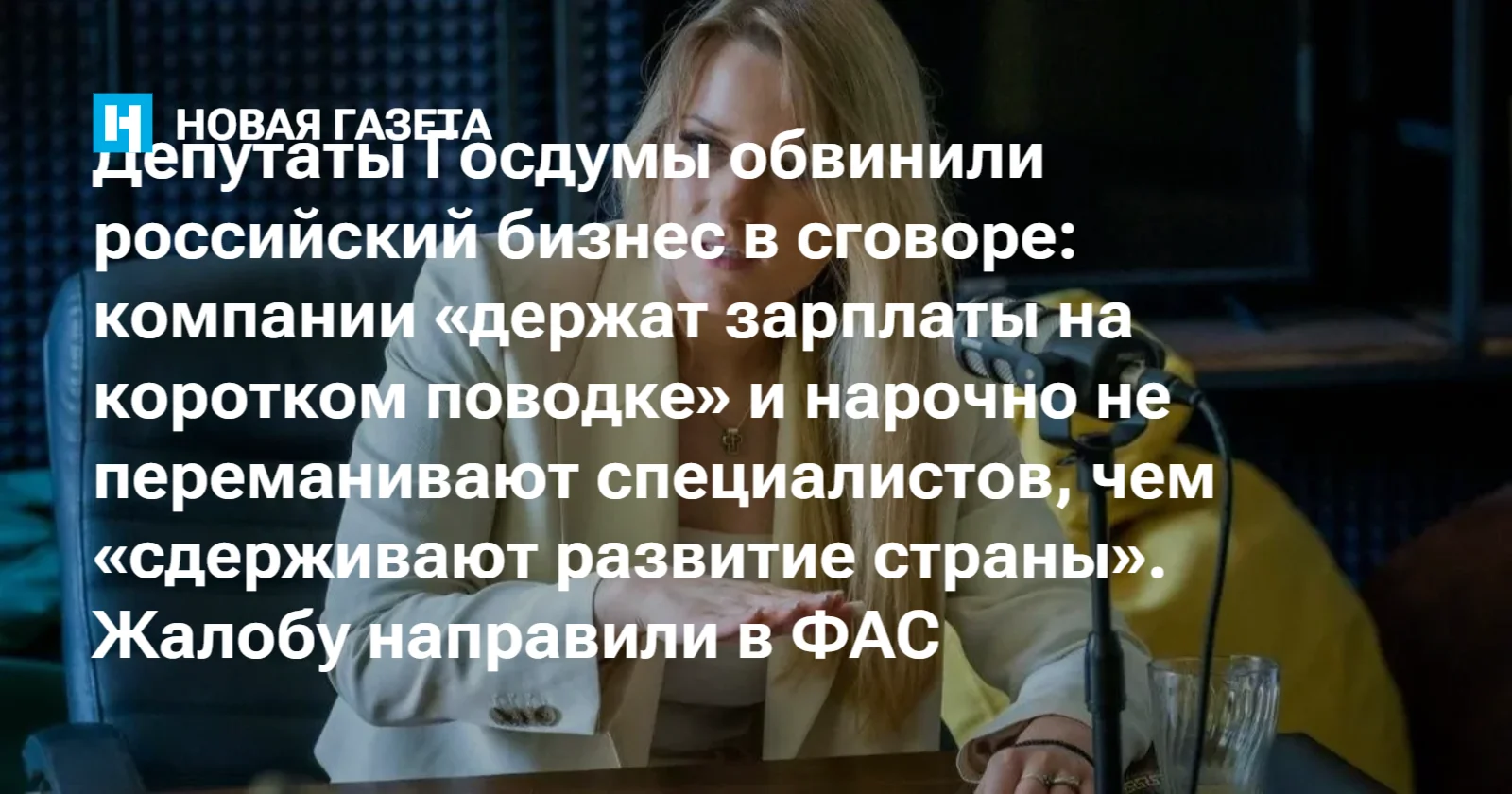 «В данной ситуации, возможно, зарплаты искусственно держат на коротком поводке. Поэтому прошу ФАС проверить, существуют ли такие практики обмена информацией и договоренности о непереманивании сотрудников», — прокомментировала Лантратова свое письмо ФАС журналистам.