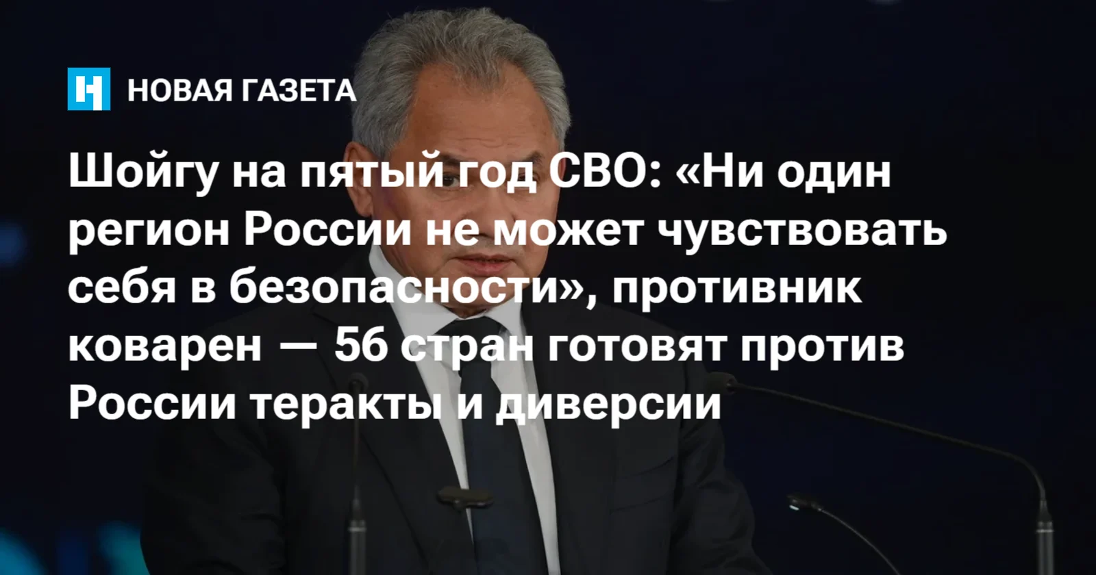 Россия, по словам Шойгу, должна сегодня «с высочайшей организованностью» противостоять действиям «56 стран, пытающихся совершать теракты и диверсии» на объектах в России.