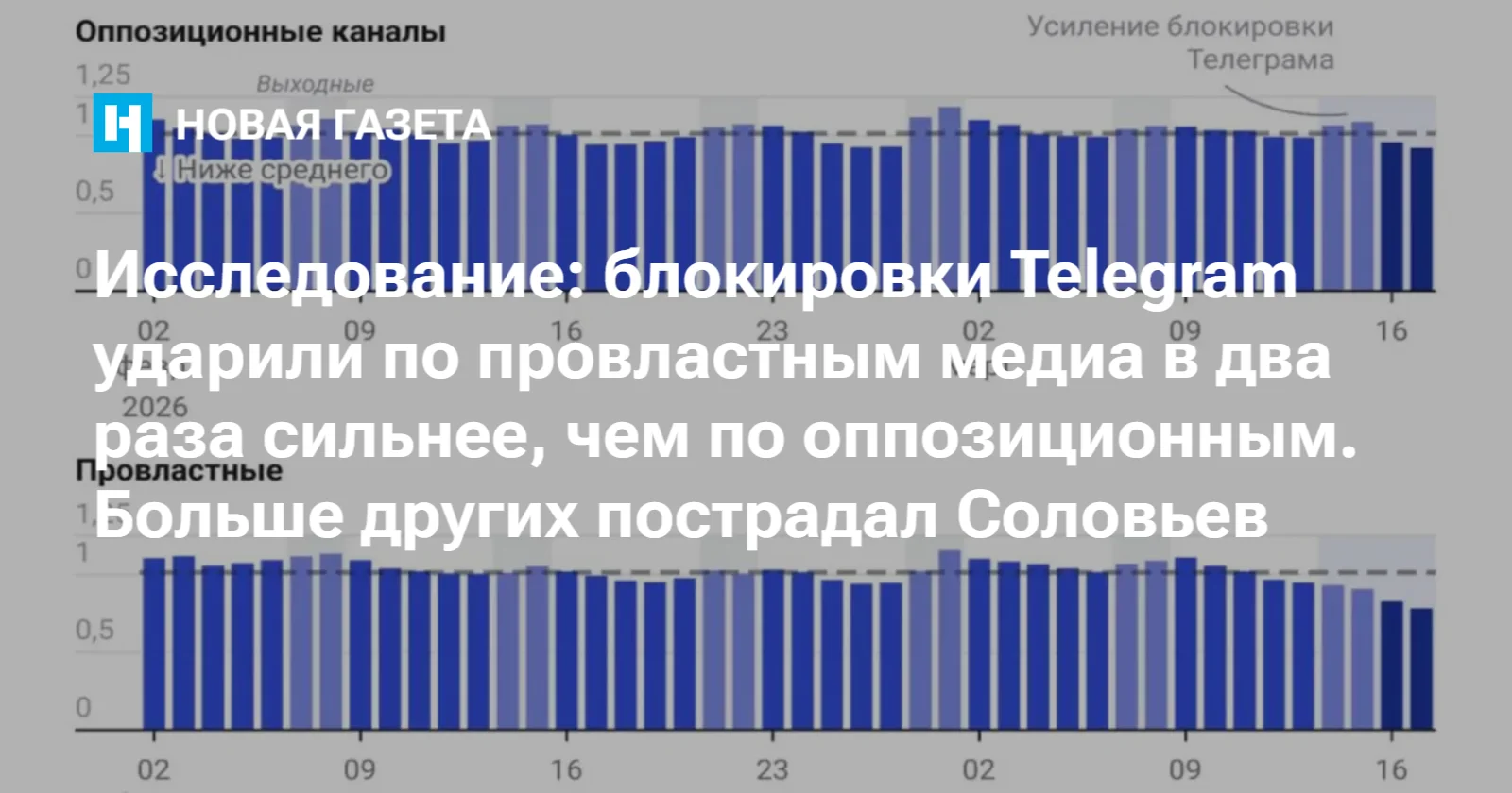 Частичная блокировка Telegram в России началась с осени 2025 года, когда власти запретили возможность осуществлять через платформу аудио- и видеозвонки. С 1 марта 2026 года блокировки усилились, еще более жесткий режим блокировок РКН включил в середине марта. Исследователь отметила, что у провластных СМИ в Telegram падение началось уже с субботы, 14 марта. У оппозиционных — с понедельника, 16 марта.