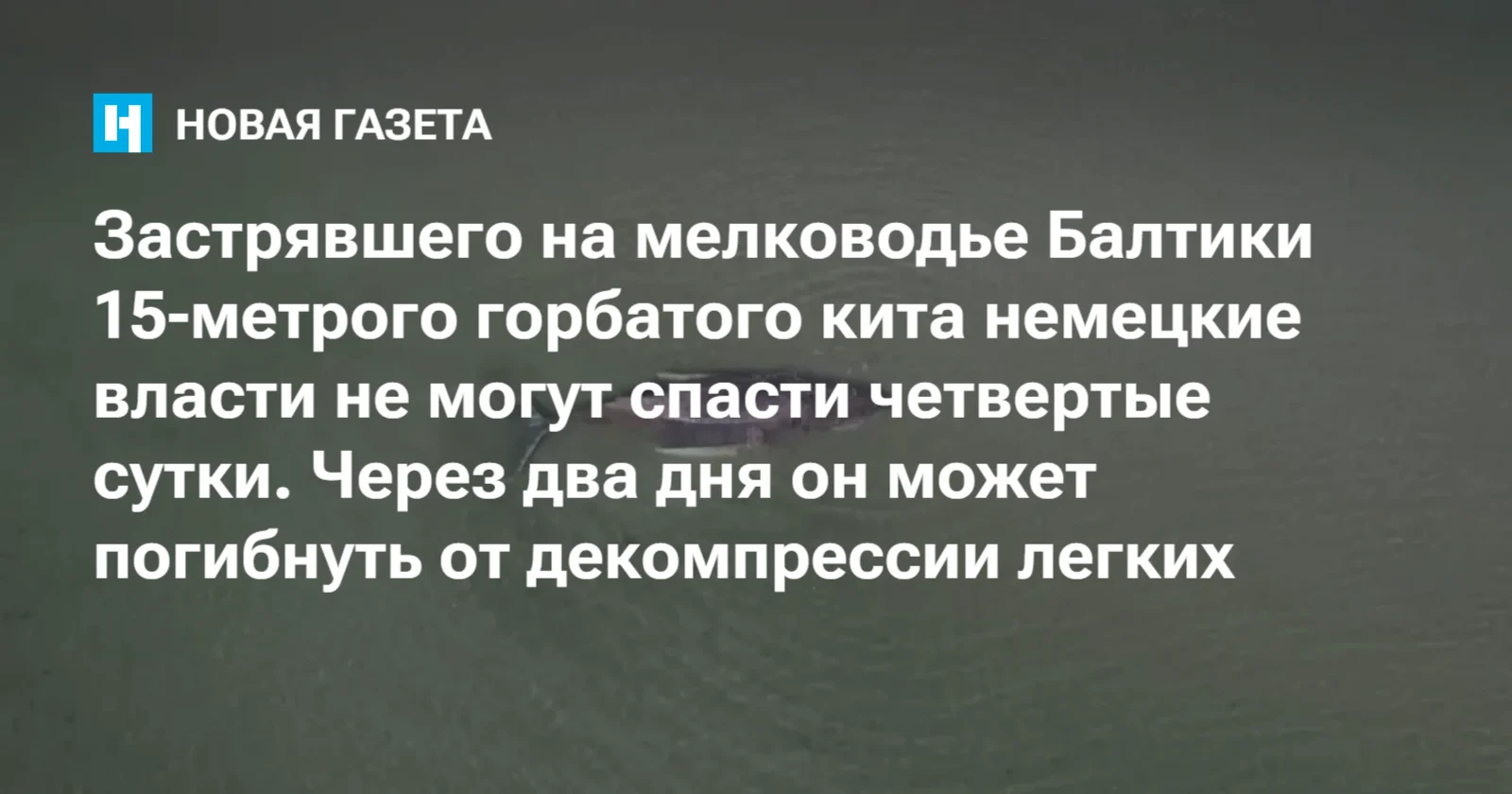 Горбатый кит «сел на мель» в Балтийском море в зоне государственных интересов Германии, самостоятельно уйти на глубину он не может четвертые сутки, под ним песчаное дно.