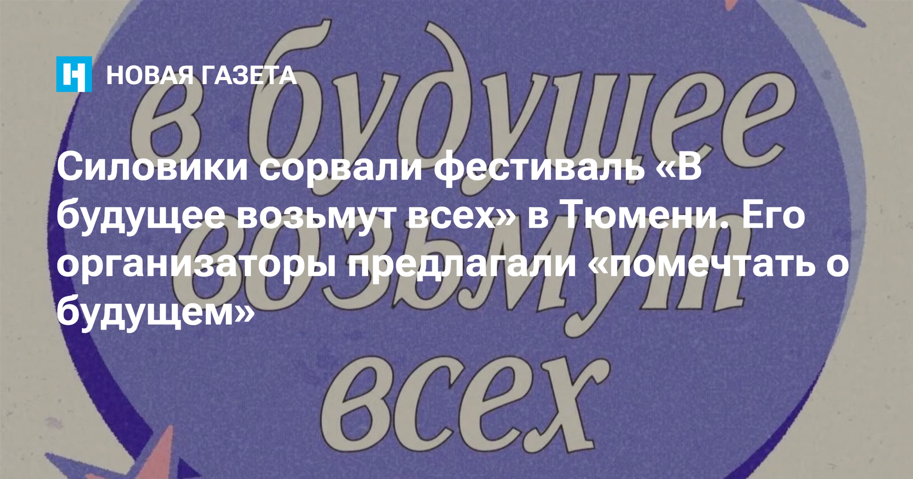 - Фестиваль «В будущее возьмут всех» задумывался как пространство для «локальных инициатив» и нетворкинга активистов. В программе были кинопоказы, дискуссии об урбанистике, климате и стрит-арте. Организаторы писали, что хотят «помечтать о будущем» и обсудить, как приблизить его к реальности.