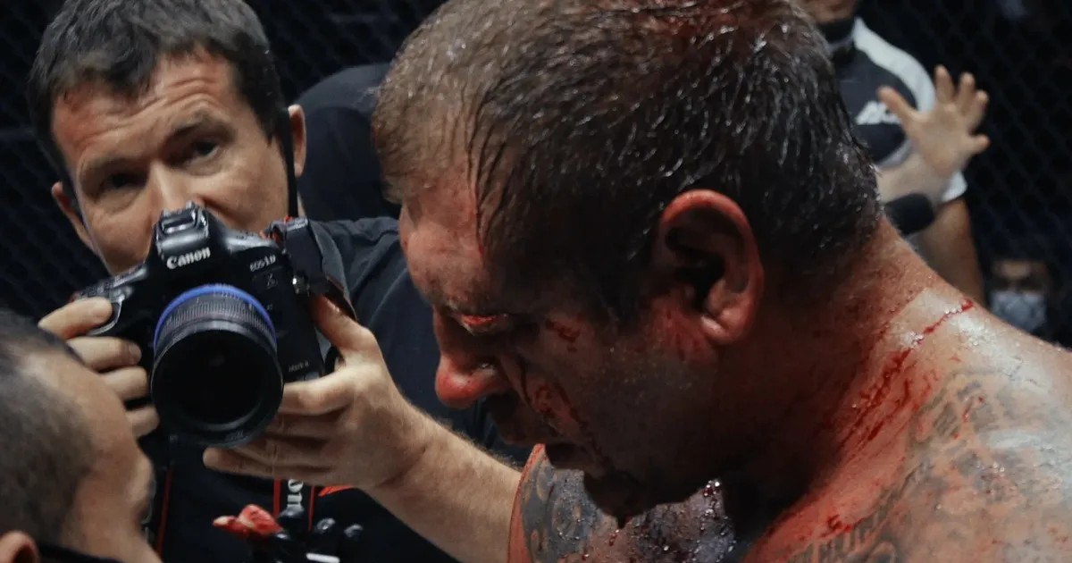 Итак, герой. Богатырь под два метра, боец ММА, многократный чемпион мира по боевому самбо в тяжелом весе. Автор сразу ломает стереотипы спортивной драмы. С первых же кадров очевидно: она предъявляет редкой откровенности непарадный портрет с чрезвычайно близкого расстояния. Фильм снимался в начале пандемии COVID-19, в первые месяцы 2020 года, когда 38-летний спортсмен готовился к бою с Магомедом Исмаиловым. Вступительный титр: «После двухлетнего простоя это может быть последний шанс». «Простоя»? Мы наблюдаем этот «простой» воочию. Триумфы, медали — в прошлом. Сейчас лихое, неостановимое пьянство. Несмотря на уговоры близких, скандальный гулливер идет шатающейся походкой в магазин, затаривается крепким. Братается с влюбленным по уши в него фанатом и тут же невыносимым образом унижает его. Растекается блаженной улыбкой в мечтах о невесте, скучает по дочке… И придушивает кальянщика в ресторане — ну не понравился… Обижает «даму по вызову». Устраивает пьяный дебош в частном отеле, и его забирают в полицию. Никогда не знаешь, облобызает он тебя или придушит. То же — с фильмом. Это такие качели: от любопытства, симпатии, смеха — к брезгливости, от жалости — к отвращению. Мы следим за этим душевным обрывом, моральным полетом по над пропастью, по краю. Изумляясь находчивости и хитрости бражника, который готов обещаниями морочить голову близким и себе самому.