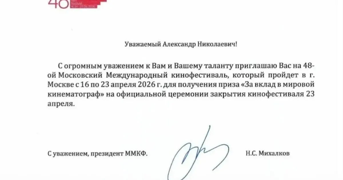 Приглашение с подписью Никиты Михалкова, переданное Александру Сокурову 30 марта
