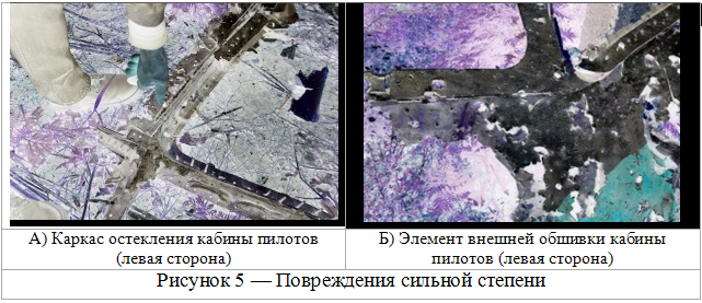 Наибольшие повреждения сильной степени наблюдаются в носовой части самолета в районе кабины пилотов (левая сторона), крыши кабины пилотов и на воздухозаборнике левого двигателя. Примеры повреждений сильной степени приведены на рисунке 5 .