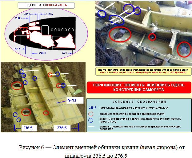 Наибольший интерес представляет анализ повреждений крыши кабины пилотов. На рисунке 6 представлен элемент крыши за кабиной пилотов, который в Предварительном отчете Международной комиссии являлся примером множественных осколочных повреждений конструкции планера самолета.