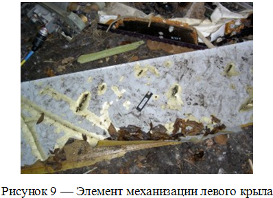 Анализ повреждений элементов механизации (закрылка) левого крыла позволяет с уверенностью утверждать, что он находился в основном поле накрытия осколками. Это объясняется наличием множественных повреждений (поражающими элементами разных фракций, легких и тяжелых), а также количеством повреждений (плотность пробоин на 1 кв. метр с учетом удаления от точки подрыва боевой части ракеты и эффективной площади элемента даже выше, чем на обшивке левого борта за кабиной пилотов).