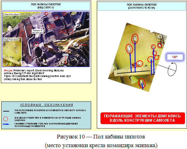 Анализ повреждений внутренних элементов конструкции самолета проводился преимущественно по оценке повреждений кабины пилотов (пол кабины пилотов, кресло второго пилота, педальный узел). На рисунке 10 представлена часть пола кабины пилотов, которая в Предварительном отчете Международной комиссии также являлась примером множественных осколочных повреждений.