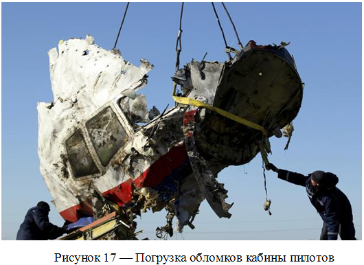 Анализ фотографии ( рис. 17 ) показывает, что в районе катастрофы правая часть кабины пилотов и передний гермошпангоут были одним целым, и при этом сохранилась часть остекления кабины на месте второго пилота (правая сторона). При подрыве боевой части ракеты, ориентированной параллельно самолету (в пределах 0-20 град.) повреждения носили бы совершенно другой характер. При такой ориентации ракеты основное направление движения поражающих элементов — поперек конструкции самолета. В этом случае боевая часть ракеты отсекла бы носовую часть самолета, а все сохранившиеся элементы правого борта в районе кабины пилотов имели бы множественные выходные отверстия.