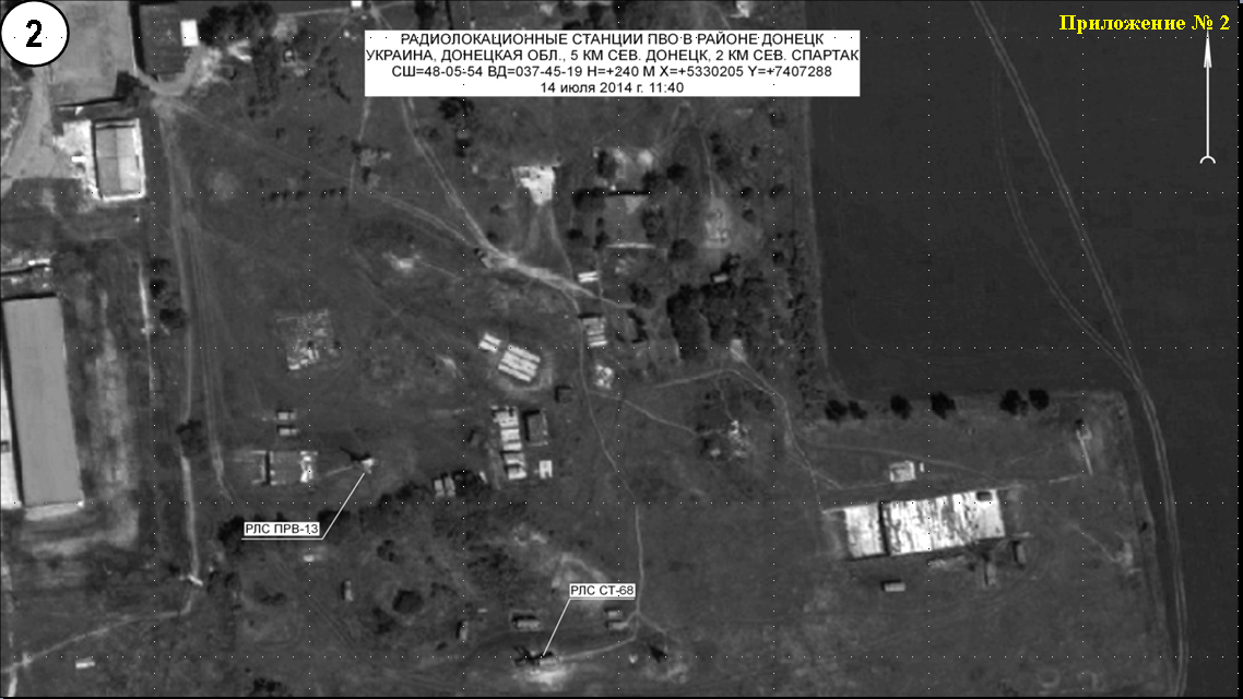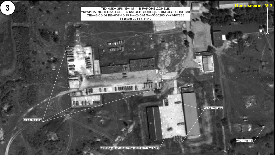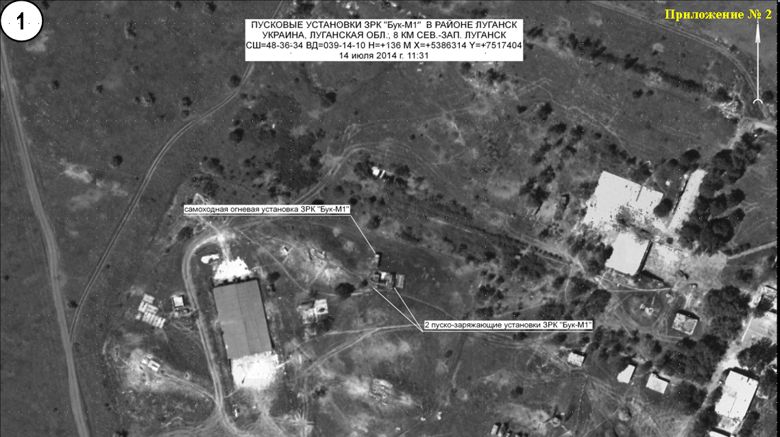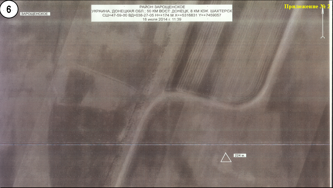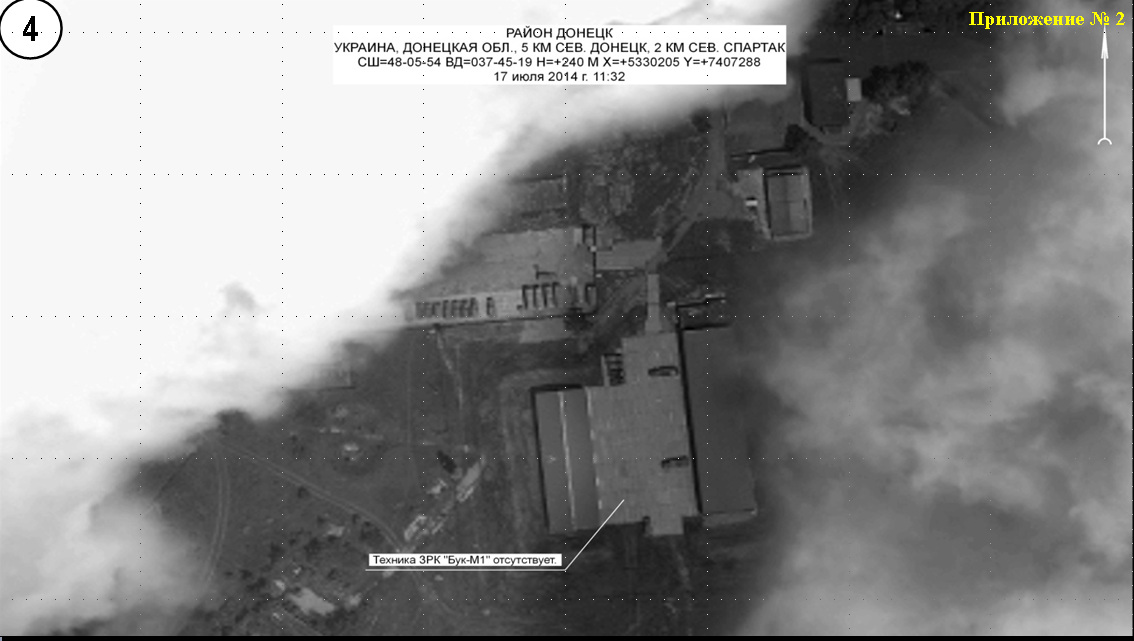 Необходимо отметить, что именно в районе н.п. Зарощенское по данным космической разведки МО РФ 17.07.2014 г. ( №№4, 5 см. ниже ) располагались самоходные огневые установки ЗРК «Бук» ВС Украины.