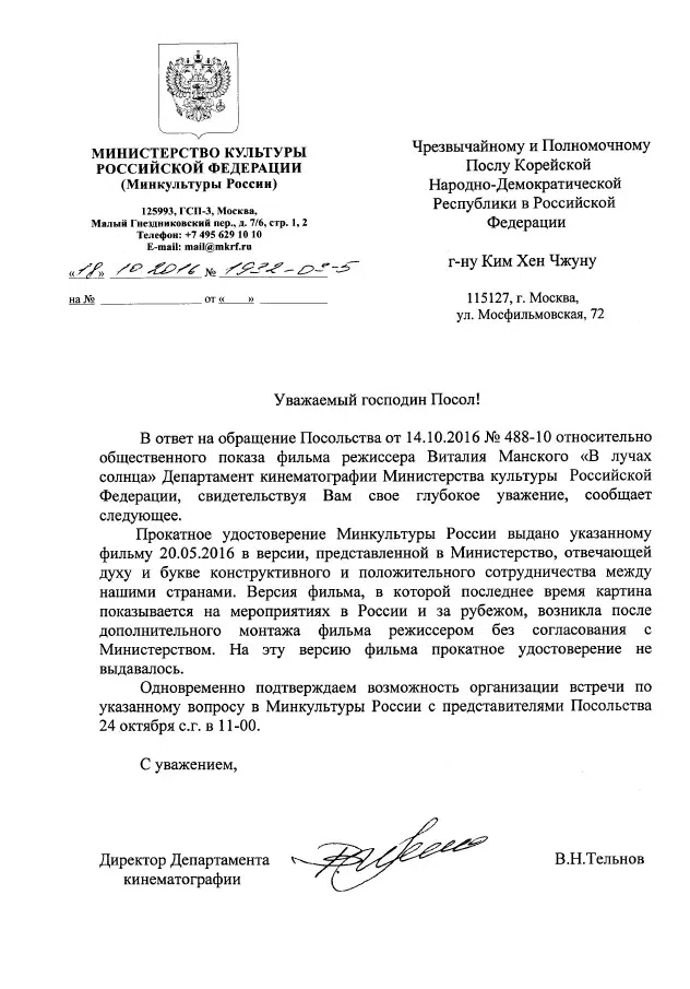 В распоряжении редакции «Новой газеты» оказалась копия документа, отправленного в посольство КНДР и подписанного директором департамента кинематографии Минкульта. Документ подтверждает предположение, высказанное ранее режиссером фильма о Северной Корее Виталием Манским о том, что российское государство, ограничивая прокат его киноленты «В лучах солнца», реагирует на требования северокорейских властей.