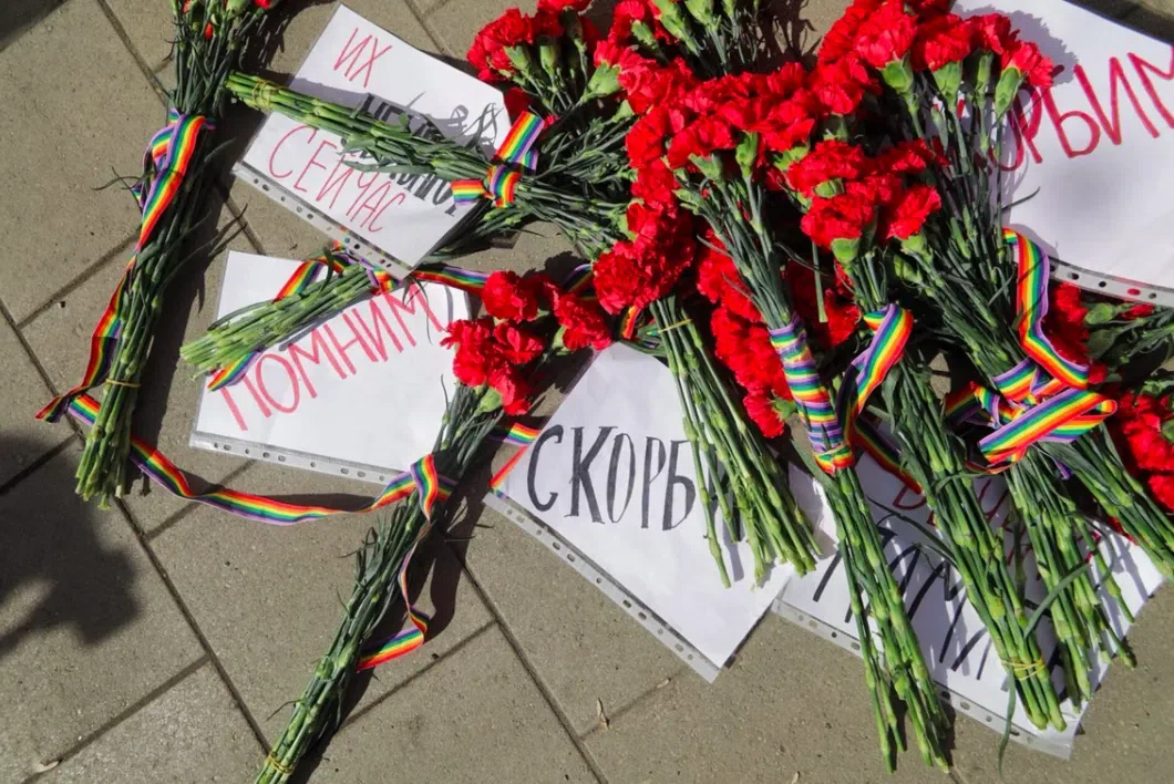 В годовщину начала преследования геев в Чечне ЛГБТ-активисты установили мемориал и возложили цветы к постпредству республики в Москве.